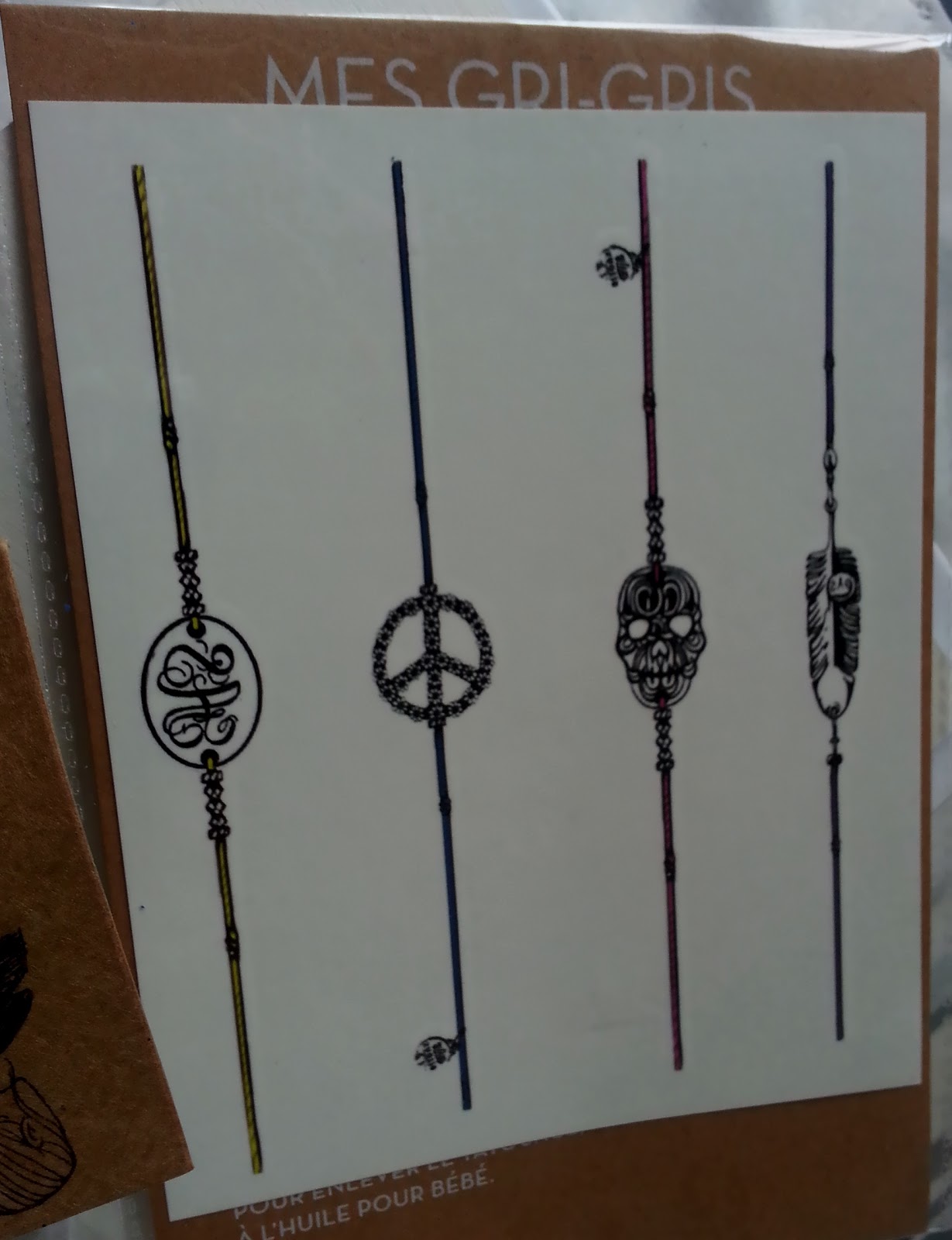 - des tatouages éphémères. J'avoue, je ne les ai pas étudiés de près, j'étais un peu débordée, mais à la forme, je dirais qu'ils sont prévus pour être portés au poignet. Comme je me tatoue déjà aux décalcos Malabar, je suis évidemment ravie de tester ceux-ci, d'autant que les designs sont un peu plus proches de mes goûts que ceux des fameux chewing-gums. Même le signe de paix semble décoré de strass :)